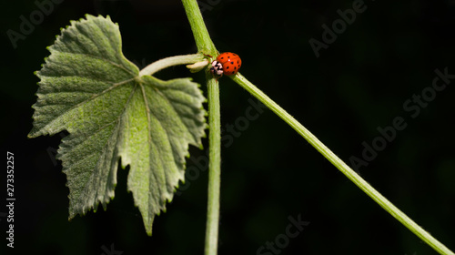 Obraz premium Ladybug crawling on the vine. Isolated on black background. Selective focus.