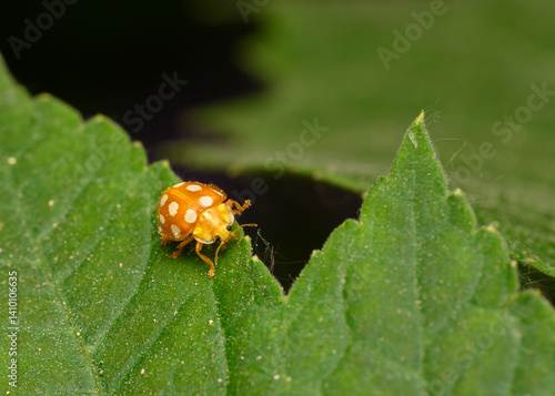 Fototapeta premium Ladybug crawls along the edge of the leaf