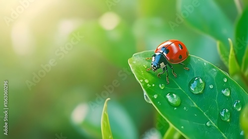 Fototapeta premium Ladybug crawls on dewy leaf in nature