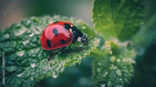 © TheWaterMeloonProjec, Obraz premium Ladybug Feeding on Leaf in Macro Shot