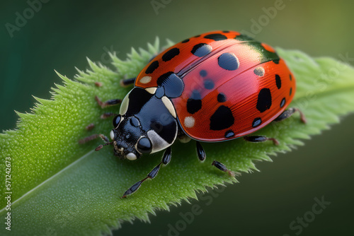 © Rawf8, Naklejka premium Ladybug ladybird on green leaf, nature background, close up. Generative AI