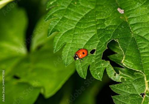 Fototapeta premium ladybug looking for nectar on a green leaf