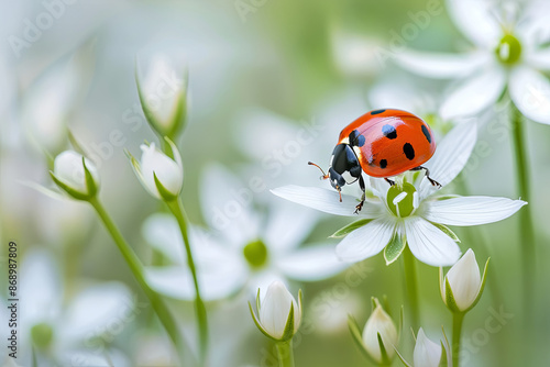 © Emanuel, Fototapeta premium Ladybug on a blooming stellaria holostea flower, delicate nature