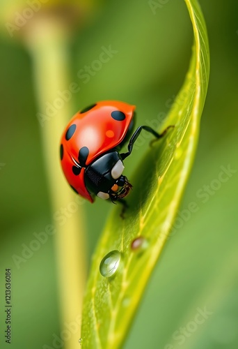 © anomalicreatype, Fototapeta premium Ladybug on a Dew-Kissed Leaf: A Vibrant Macro Photograph