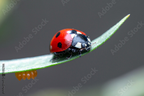 © Sylvia, Naklejka premium ladybug on a milkweed leaf with ladybug eggs