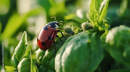 © Lesuna, Obraz premium Ladybug on Basil Plant