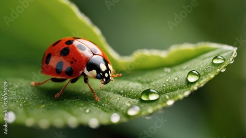 © Hasriana, Fototapeta premium Ladybug on Dew-kissed Green Leaf Close-up Shot, Capturing Nature's Detail