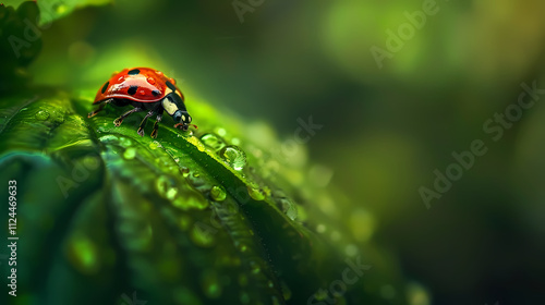 Fototapeta premium Ladybug on Dew-Kissed Leaf: A vibrant red ladybug rests on a lush green leaf,...