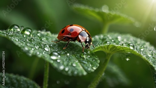 © Abdul, Obraz premium Ladybug on dewy green leaf