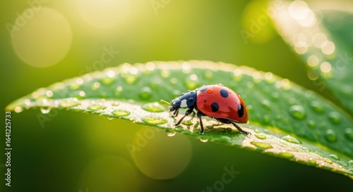 © MUCHAMAD, Obraz premium Ladybug on dewy leaf, bathed in sunlight