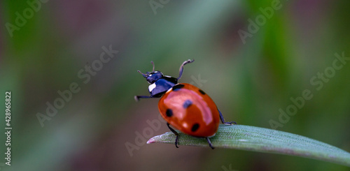 © Ella, Obraz premium Ladybug on grass saying hello. Blurred background. Macro