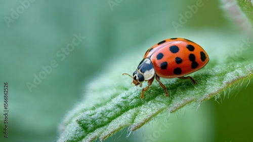 © irma, Fototapeta premium Ladybug on green leaf closeup