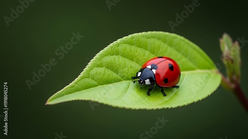 © ahmad, Obraz premium Ladybug on Green Leaf with Black Background.