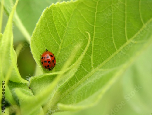 © Mona, Fototapeta premium Ladybug on sunflower leaf