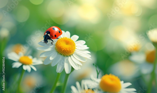 © Q STOCK, Obraz premium Ladybug on the chamomiles flower, spring background