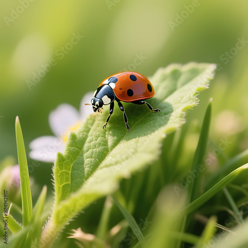 © Данил Шкадоревич, Fototapeta premium Ladybug on the grass close-up macro.created with the help of artificial intelligence.