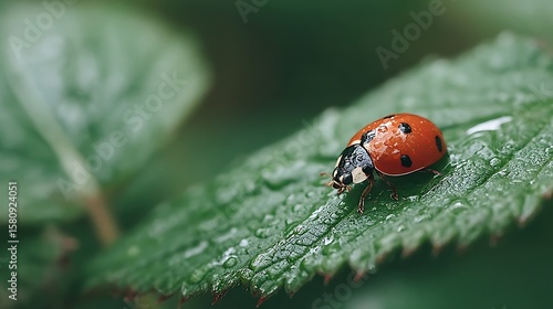 © Noah, Obraz premium Ladybug on Wet Green Leaf