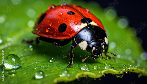© zerogami, Obraz premium Ladybug on Wet Leaf.
