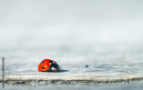© Dan Badiu, Obraz premium Ladybug on wooden surface macro minimal spring concept