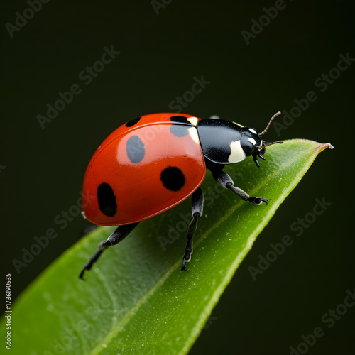 © KM, Naklejka premium Ladybug Perched: A vibrant ladybug with its distinctive red and black spotted shell is delicately perched on a green leaf, showcasing its intricate details against a darkened background.