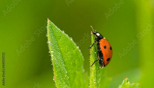 Fototapeta premium Ladybug perched on a dew-covered leaf.