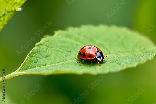 © Mr. B, Fototapeta premium Ladybug perched on a leaf with droplets of water.