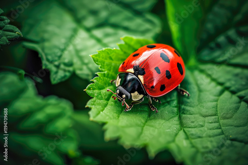 Fototapeta premium Ladybug, red with black dots green plant leaf. A beautiful brigh