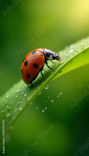 © asri.nl, Naklejka premium Ladybug resting gently on a green blade of grass