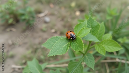 Naklejka premium Ladybug resting on a green leaf in natural surroundings.