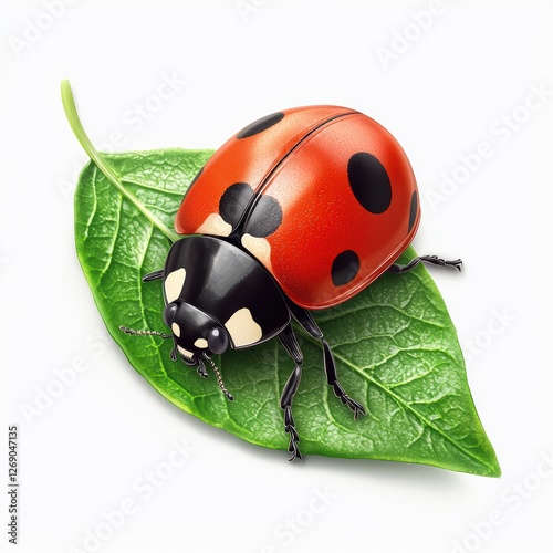 © Svitlana, Naklejka premium Ladybug resting on a green leaf isolated on white