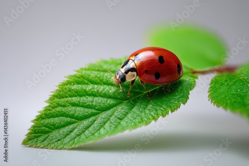 © Alive, Obraz premium Ladybug resting on a vibrant green leaf with a striking red shell showcasing nature's delicate beauty