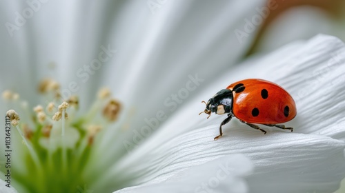 © Anat art, Naklejka premium Ladybug Resting on a White Flower Symbolizing Good Luck in European Belief During Springtime