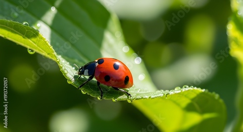 © Nassikha, Obraz premium Ladybug Resting on Green Leaf