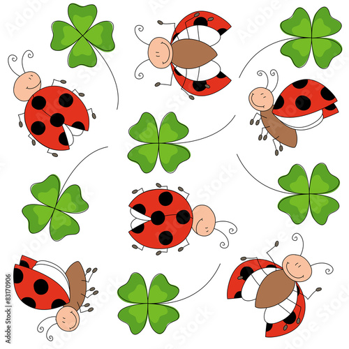 Fototapeta premium Ladybugs cartoon characters with clover isolated pattern