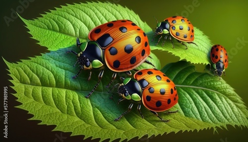 Obraz premium Ladybugs ladybirds on green leaf, generative ai