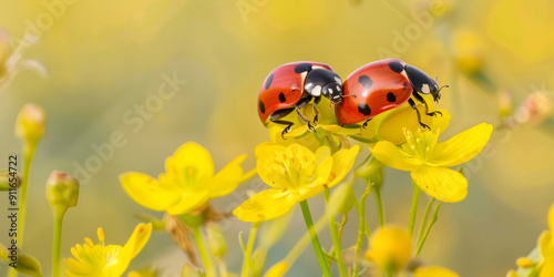 © Maestro, Naklejka premium Ladybugs on a yellow flower in a spring garden