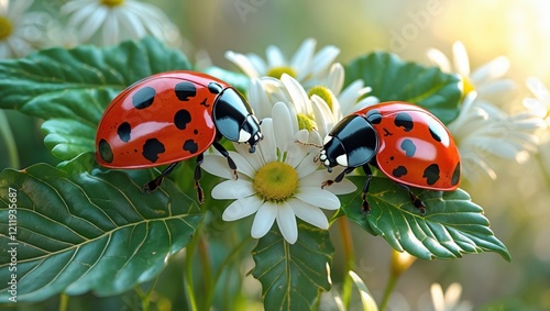 © Purnama Alam, Fototapeta premium Ladybugs on Daisies: A Vibrant Summer Garden Scene