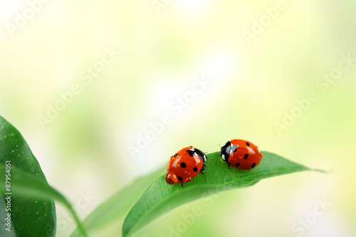 Obraz premium Ladybugs on leaf on blurred background