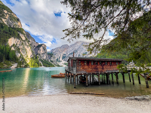 Naklejka premium Lago di Braies or Lake Braies crystal blue lake with wooden rowing boats in Italian Dolomites. Mountain forest lake in Italian alps Dolomites South Tyrol. Woden cabin hut and pontoon above the lake.