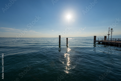 © Alberto Masnovo, Obraz premium Lago di Garda. The Lake Garda view from the port of the small town of Lazise, tourist resort on the coast, Verona province, Italy, southern Europe. In the background the coast of Lombardy.