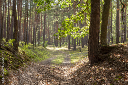 © qrrr, Naklejka premium Łagodne i ciepłe ostatnie letnie promienie słońca na leśnej drodze