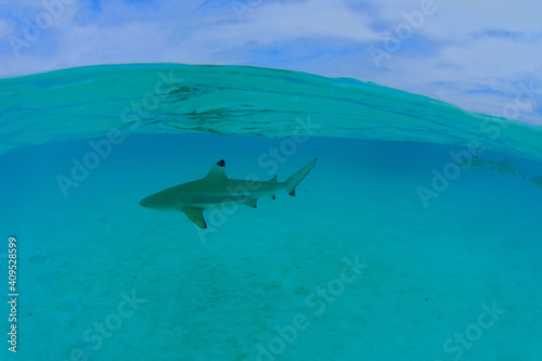 Fototapeta premium lagon translucide de moorea avec un requin pointe noire - polynesie francaise