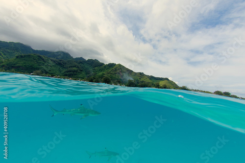 Fototapeta premium lagon translucide de moorea avec un requin pointe noire - polynesie francaise