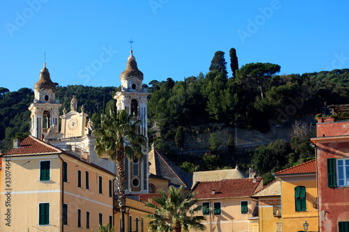 © PaoloGiovanni, Fototapeta premium Laigueglia (SV), Italy - February 15, 2017: Laigueglia houses and the bell tower, Riviera dei Fiori, Savona, Liguria, Italy.