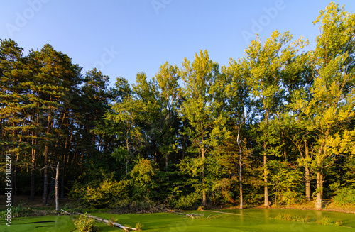 Naklejka premium Lake and forest view. The water in the lake is blooming.