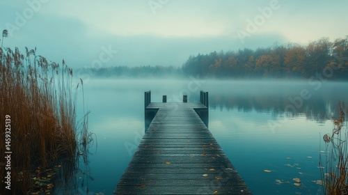 © lisa, Naklejka premium Lake and Pier in Foggy Autumn Landscape