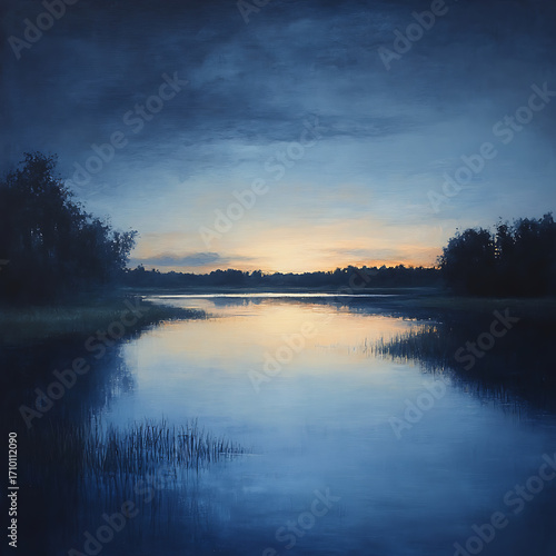 © Anup, Fototapeta premium Lake at dusk surrounded by trees and glowing horizon high resolution picture