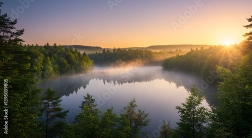 © egavirgian art, Fototapeta premium Lake at Sunrise with Fog and Forest Scenery