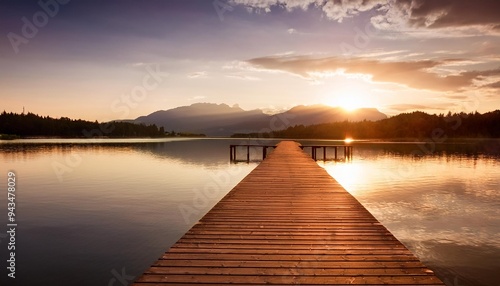 © Debbie, Fototapeta premium lake at sunset long wooden pier