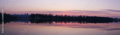 Fototapeta premium Lake at sunset, on a background of trees. Reflection of nature in the lake. Diamond Lake Kiev, Ukraine.